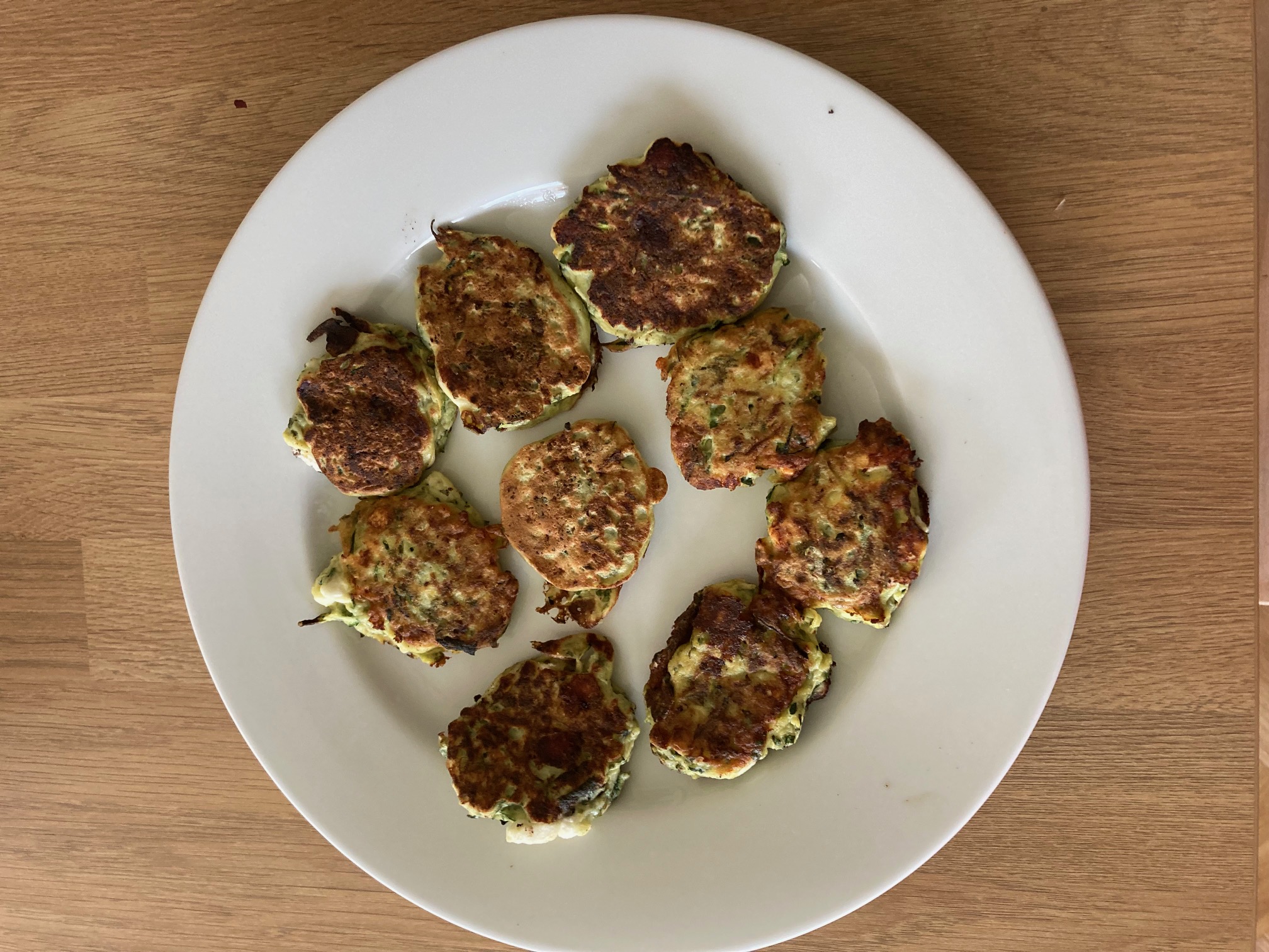 Put a large frying pan on a medium heat with ½ tbsp olive oil. Spoon tablespoons of the fritter mixture evenly into the pan & fry for 2 minutes on each side until golden.