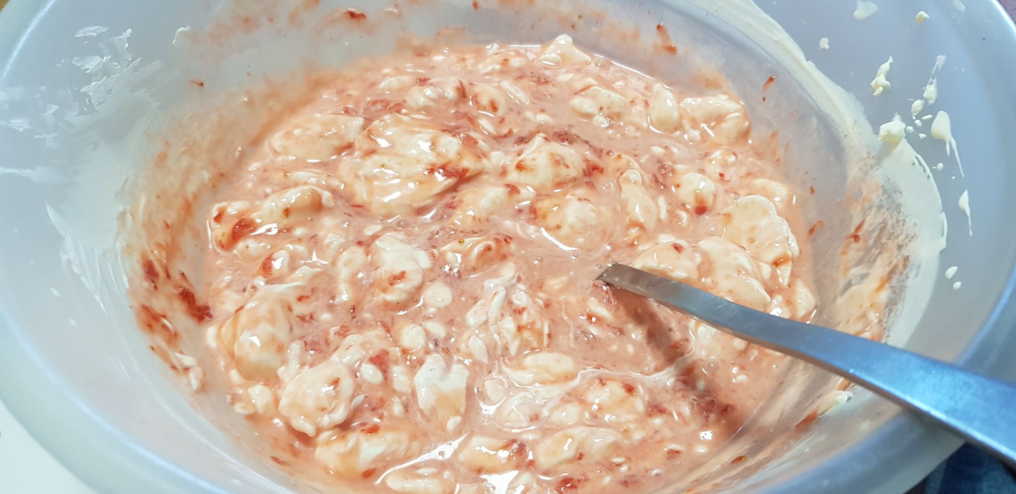 Chop, smoosh with fork, blend etc strawbs, mix in sugar, stir in whipped cream.