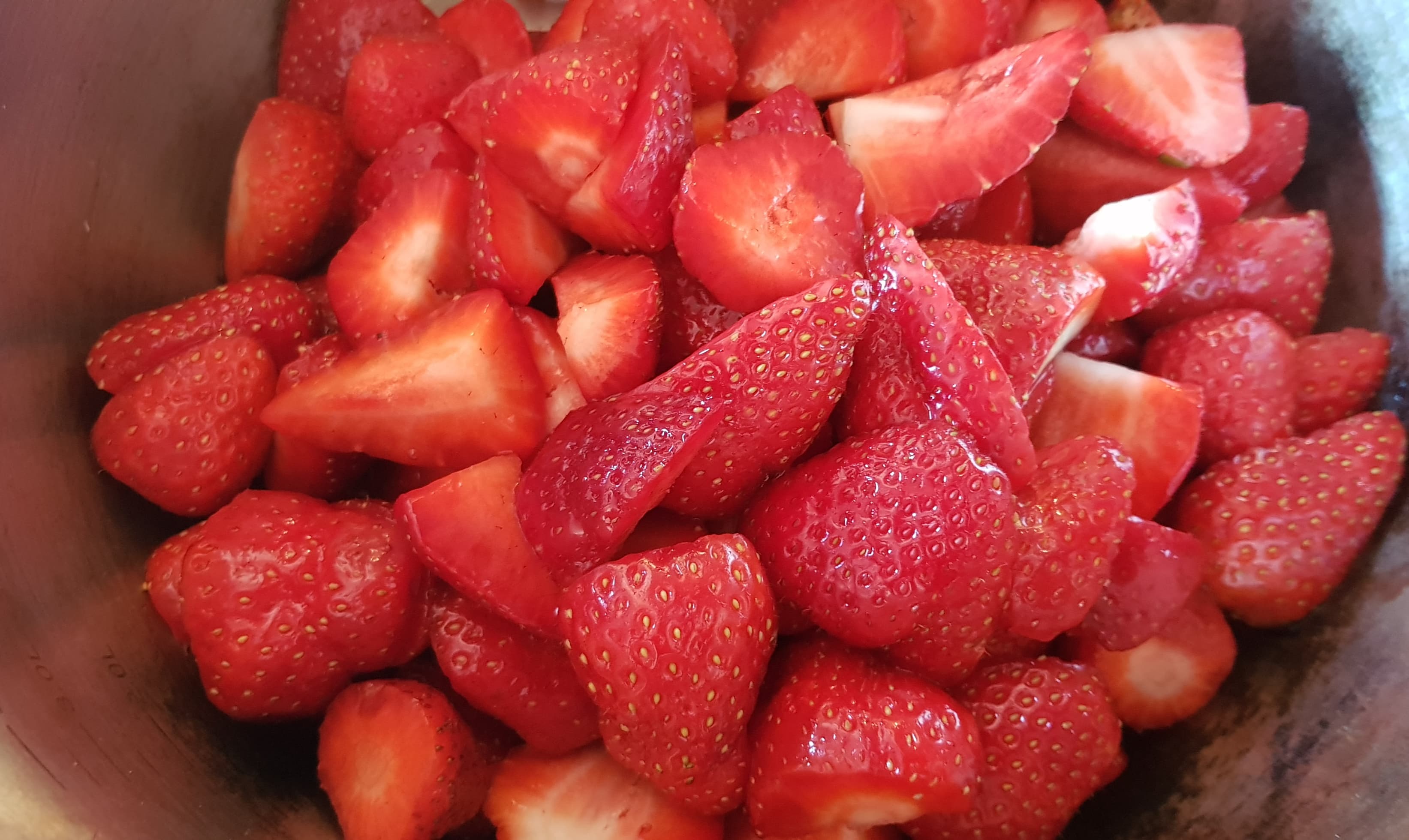 First of all pick the strawberries you would like to use for jam, weigh them and then cut up.