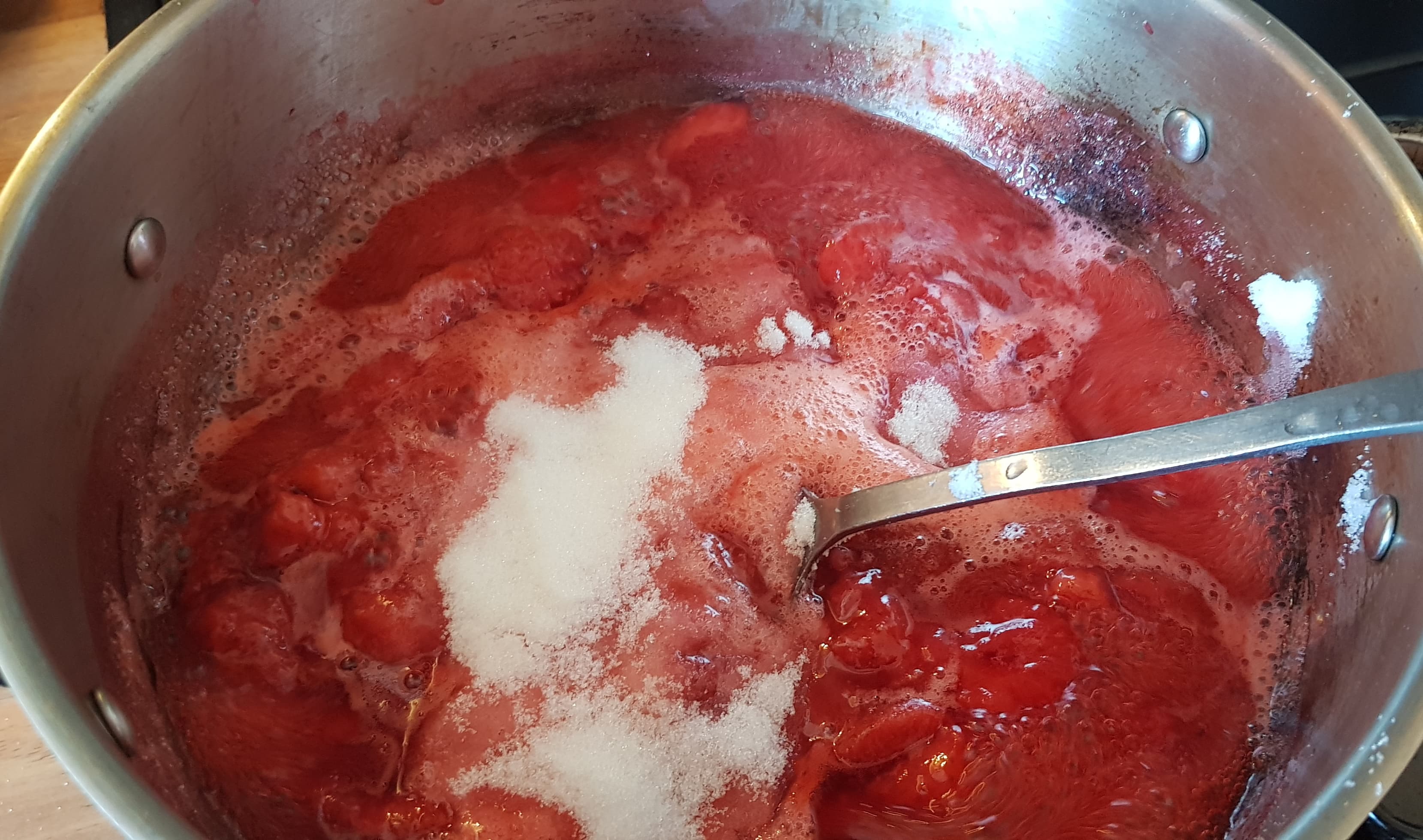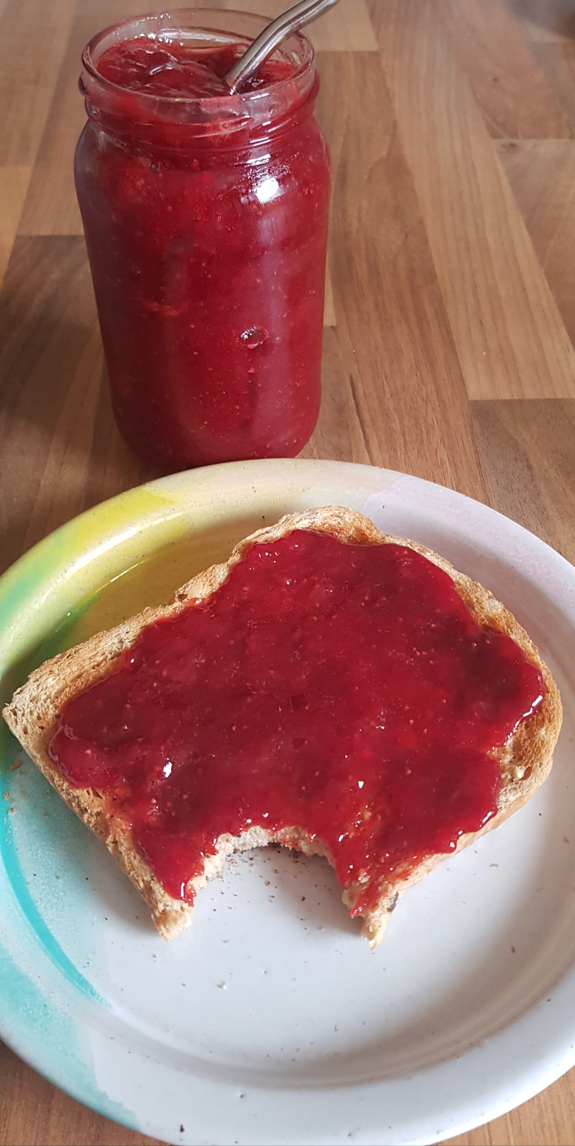 Strawberries are being donated to the larders a couple of times a week just now! Most of them are perfect just to eat straight away and some are ideal for jam. Jam is easy to make and a great way to keep enjoying our local strawberries even after the growing season. Once jarred up it can stay in your cupboard for about a year.