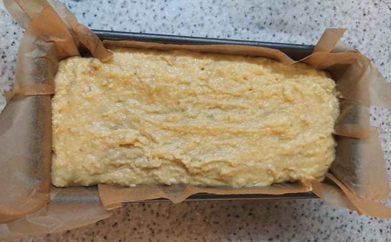 Fold in the remaining flour, baking powder and mashed bananas till mixed.